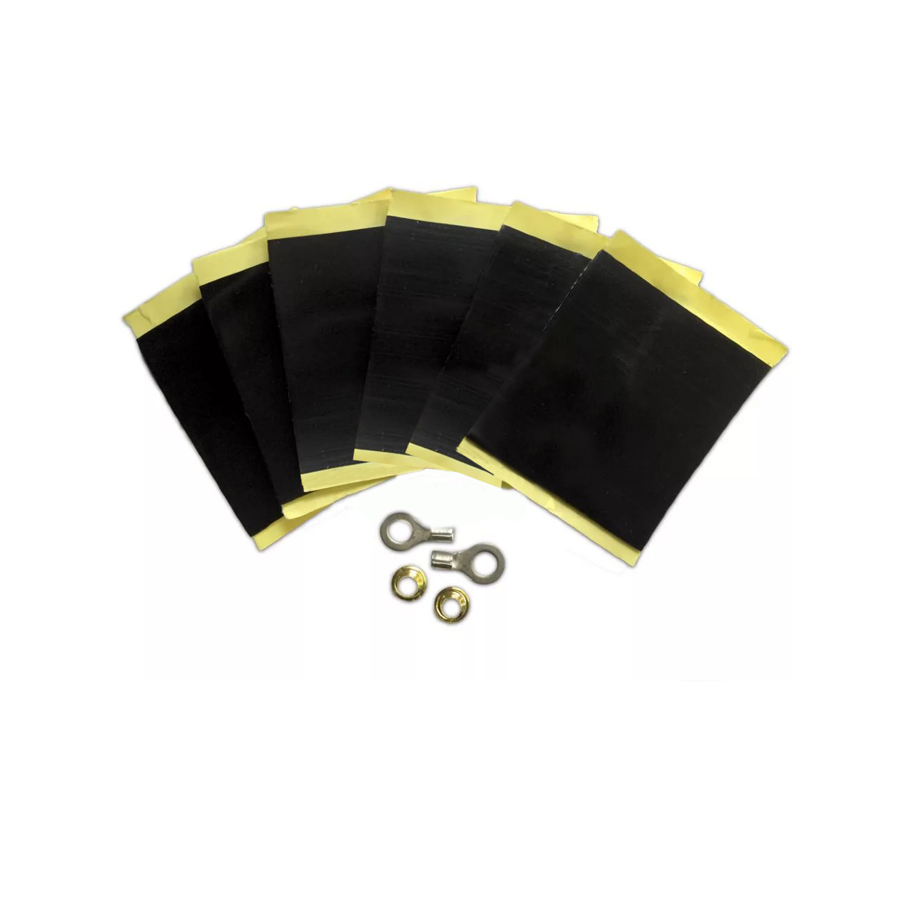 Комплект заделок состоит из двух наконечников для провода, четырех зажимных колец ("папа-мама") и пяти отрезков битумной изоляции (влагостойкий скотч). Один комплект заделок служит для подключения одной полосы инфракрасного пленочного теплого пола.