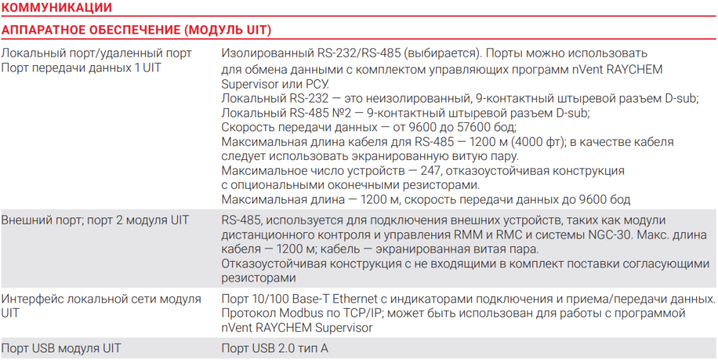 Терминал пользовательского интерфейса nVent RAYCHEM UIT3-EX — центральный модуль системы NGC-30. Модуль UIT также может использоваться системой NGC-20 (более подробная информация приведена в таблице технических характеристик NGC-20). С его помощью осуществляется контроль электрообогрева, настройка системы и сбор информации для обслуживания. Терминал пользовательского интерфейса nVent RAYCHEM (NGC-UIT3-EX) оборудован 8,4-дюймовым цветным сенсорным ЖК-дисплеем. Это обеспечивает простое взаимодействие с пользователем при настройке без необходимости использования клавиш или кнопок с непонятными метками. Модуль nVent RAYCHEM UIT через внешний порт RS-485 подключается к другим устройствам системы, а также через интерфейсы RS-232/RS-485/ Ethernet (выбирается пользователем) к компьютеру с программой nVent RAYCHEM Supervisor или системе управления технологическими процессами завода. Модуль выпускается в виде двух моделей: nVent RAYCHEM NGC-UIT3- EX, монтируется на дверцу панели NGC-30, и NGC-UIT3-ORD-R - удаленный терминал пользовательского интерфейса, представляющий собой монтируемый на панель дисплей (NGC-UIT3-EX) что позволяет монтировать модуль пользовательского интерфейса отдельно от других устройств системы.ТЕХНИЧЕСКИЕ ХАРАКТЕРИСТИКИ NGC-30-CRM-E