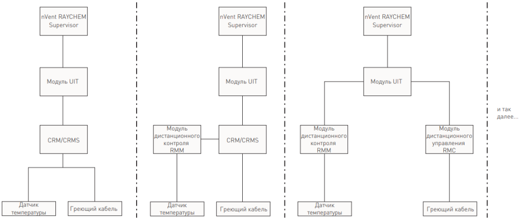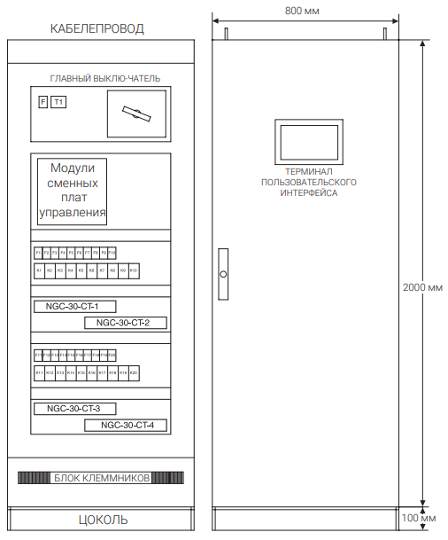 Система NGC-30 доступна в виде полной распределительной панели. Эти панели отличает легкий доступ к компонентам и заводское подключение компонентов системы; все подключения выполнены с помощью легко доступных клемм. Корпус выполнен с учетом промышленных стандартов, а подключения оптимизированы для удобства техобслуживания. Панели стандартно оборудованы УЗО (устройством защитного отключения при утечках тока на землю). Помимо описанных стандартных возможностей, пользователь может выбрать дополнительные опции в зависимости от своих требований к контролю и управлению цепями обогрева. Так, пользователь может выбрать тип реле (механическое или бесконтактное), необходимое количество цепей (плюс необходимое количество про запас), контроль напряжения, сигнальные лампы, размер панели, настройки конфигурации и т.д. Система NGC-30 может состоять из нескольких блоков, связанных с помощью коммуникационного кабеля. В общем случае главная панель включает терминал пользовательского интерфейса (UIT), встроенный в дверцу.КОМПОНЕНТЫ СИСТЕМЫ NGC-30-CRM-E