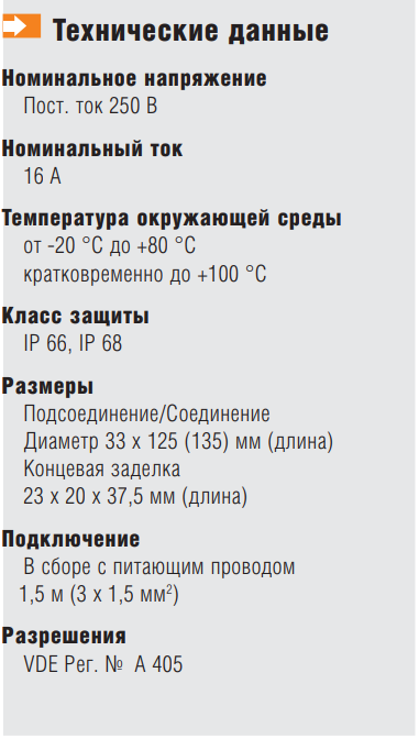 Затем греющий кабель вставляется в зажимную втулку и путем закручивания обеих внешних муфт (одна муфта имеет питающий провод длиной 1,5 м) создается контакт между греющим и силовым кабелями. Концевая заделка состоит только из одной части, в которую вставляется слегка обрезанный греющий кабель