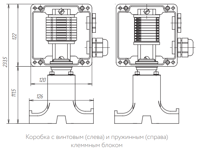 Для заказов доступны исполнения коробок с винтовыми или пружинными клеммными зажимами, а также с различными видами маркировки взрывозащиты – вида e (повышенная надежность) и вида ia (искробезопасная электрическая цепь)