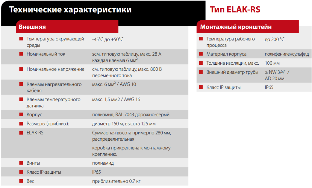 Данная инновационная распределительная коробка ELAK-RS-T обладает большим количеством преимуществ. Например, благодаря форме данной коробки нет необходимости сильно сгибать кабель, тем самым предотвращая его возможное повреждение. Благодаря встроенному монтажному кронштейну, стальные уголки не требуются. Это является преимуществом особенно при обогреве трубопроводов, так как кабель может быть вмонтирован непосредственно через монтажный кронштейн. Кроме того нет необходимости в использовании закрепляющих винтов для трубопроводов отопления и датчиков. Уникальные защелки позволяют быстро закрыть коробку без необходимости затягивать винт, тем самым предотвращая любое движение крышки. Также на крышке коробки предусмотрено место под табличку для маркировки, что позволит легко идентифицировать циркуляционное кольцо системы отопления в сложных системах.