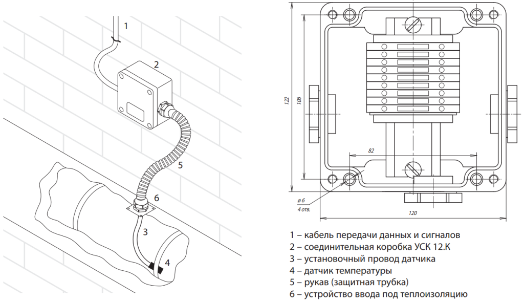 Коробка УСК 12.К предназначена для подключения кабелей систем управления электрообогревом и датчиков температуры. Коробка крепится при помощи кронштейна непосредственно на трубопроводе или близлежащей металлоконструкции, стене здания. Коробка позволяет выполнить подключение одного или двух кабелей передачи данных и сигналов, от 1 до 3 датчиков температуры. Конструкция корпуса обеспечивает защиту от проникновения влаги и пыли IP66 и высокую коррозионную стойкость. Применяемые клеммные наборы позволяют обеспечить подключение многожильных или одножильных проводов сечением от 0,5 до 2,5 мм².