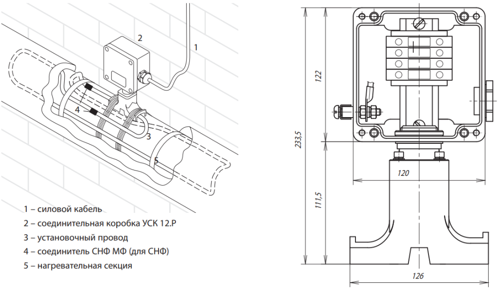 Коробка УСК 12.Р предназначена для подключения к силовой сети электрических нагревательных кабелей постоянной мощности типа СНФ и ТМФ. Коробка крепится непосредственно на трубопроводе. Коробка позволяет выполнить подключение одного или двух ниток нагревательных секций «петлей», либо 3 секций по схеме «звезда». Конструкция корпуса обеспечивает защи ту от проникновения влаги и пыли IP66 и высокую коррозионную стойкость. Применяемые клеммные наборы позволяют обеспечить подключение многожильных или одножильных проводов сечением от 1,5 до 10 мм².
