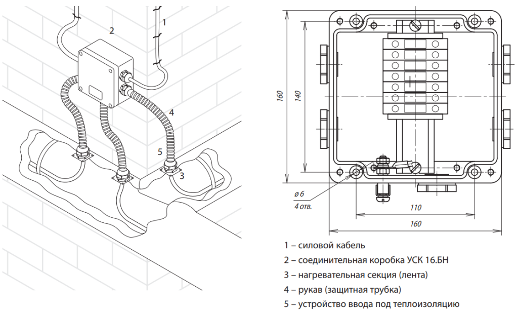 Коробка УСК 16.БН предназначена для подключения к силовой сети саморегулирующихся электрических нагревательных лент. Коробка крепится при помощи кронштейна непосредственно на трубопроводе или на близлежащей металлоконструкции, стене здания. Коробка позволяет выполнить подключение до трех саморегулирующихся электрических нагревательных лент. Конструкция корпуса обеспечивает защиту от проникновения влаги и пыли IP66 и высокую коррозионную стойкость. Применяемые клеммные наборы позволяют обеспечить подключение многожильных или одножильных проводов сечением от 1,5 до 10 мм².