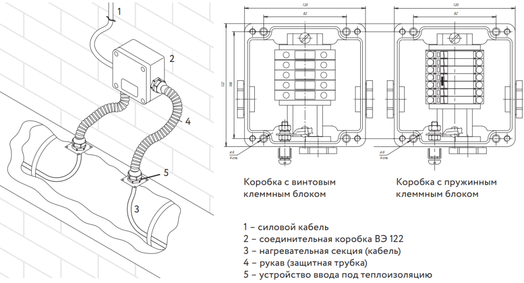 Коробка ВЭ 122 предназначена для подключения к силовой сети саморегулирующихся электрических нагревательных кабелей*, а также для разветвления саморегулирующихся нагревательных кабелей. Коробка крепится при помощи кронштейна непосредственно на трубопроводе или близлежащей металлоконструкции, стене здания. Коробка позволяет выполнить подключение до одного или двух саморегулирующихся электрических нагревательных кабелей к силовому кабелю. Конструкция корпуса обеспечивает защиту от проникновения влаги и пыли IP66 и высокую коррозионную стойкость. Применяемые клеммные наборы позволяют обеспечить подключение многожильных или одножильных проводов сечением от 1,5 до 10 мм². Для заказов доступны исполнения коробок с винтовыми или пружинными клеммными зажимами.