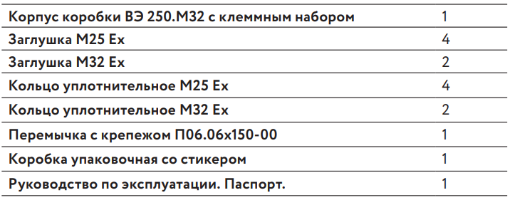 Комплект поставки соединительной коробки ВЭ 250.М32: