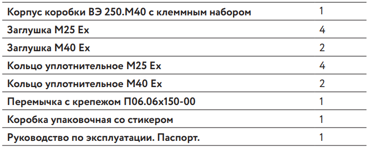 Комплект поставки соединительной коробки ВЭ 250.М32: