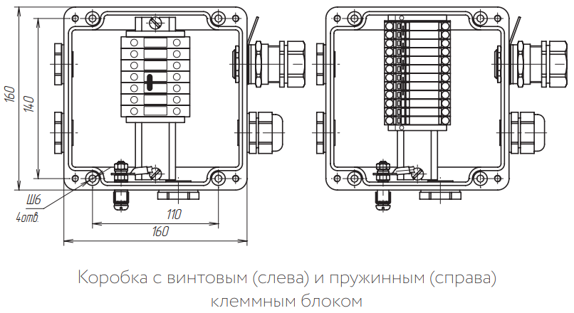 Конструкция корпуса обеспечивает защиту от проникновения влаги и пыли степени IP66 и высокую коррозионную стойкость. Кабельные вводы коробки предназначены для подключения небронированных силовых кабелей диаметром от 7 до 18 мм или бронированных силовых кабелей диаметром от 12 до 20 мм. Применяемые клеммные наборы позволяют обеспечить подключение многожильных или одножильных проводов сечением от 1,5 до 10 мм². Для заказов доступны исполнения коробок с винтовыми или пружинными клеммными зажимами.