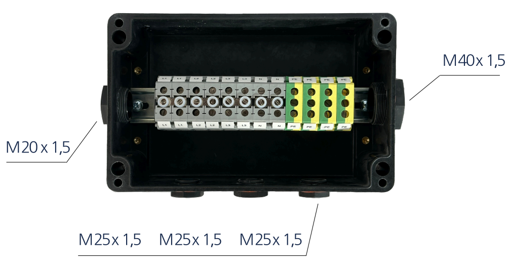 Коробка КСТ-КС-П-L(35)/6;N(35)/2;PE(35)/4-В-В:ЗВ(25)/3-С:ЗВ(32)/1-D:ЗВ(40)/1 представляет собой герметичную оболочку с установленными в ней взрывозащищенными кабельными вводами и заглушками, а также клеммами для подключения жил кабелей. В зависимости от типа присоединяемых кабелей могут применяться различные кабельные вводы.