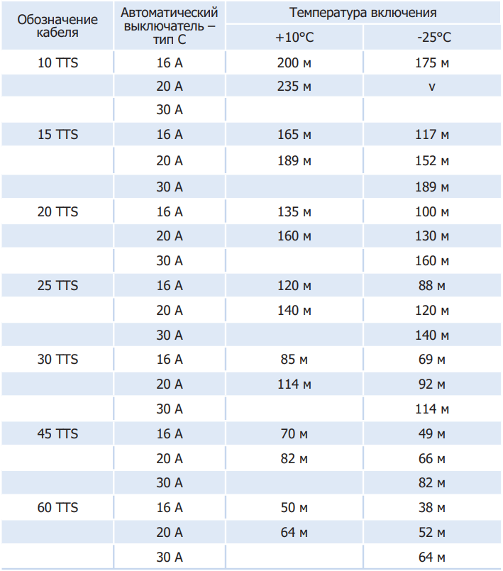 Максимальная рекомендуемая длина нагревательного кабеля при напряжении сети 230 В 20 TTSM-2-ВО