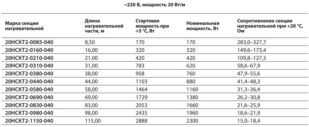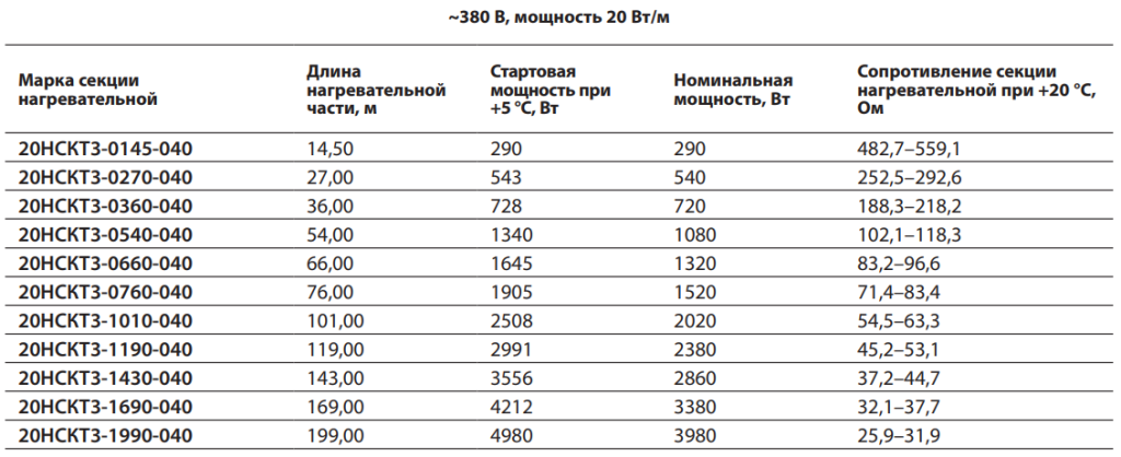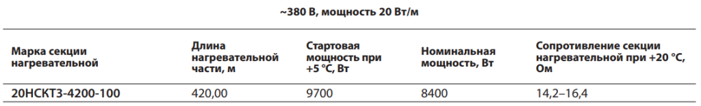 Параметры секций нагревательных кабельных 20НСКТ2-0580-040 для систем обогрева кровли: