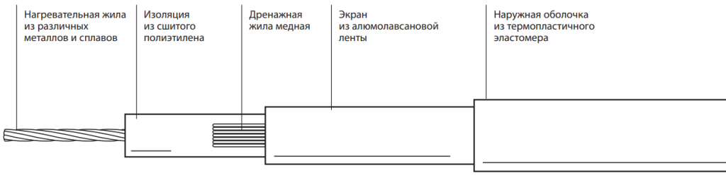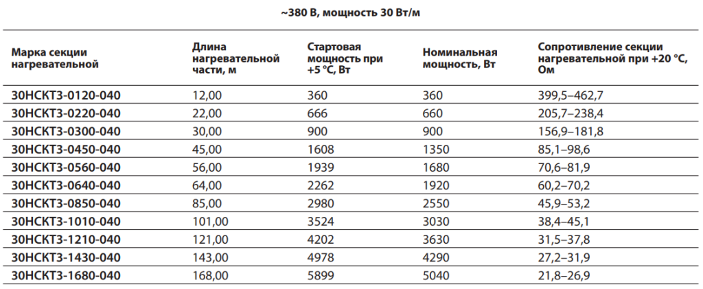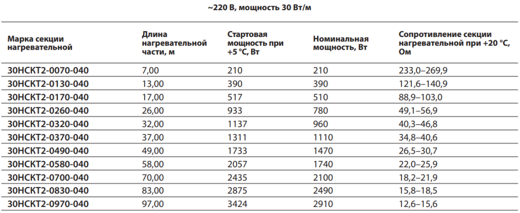 - Линейное тепловыделение 20 Вт/м (обогрев кровли) или 30 Вт/м (обогрев открытых площадей)