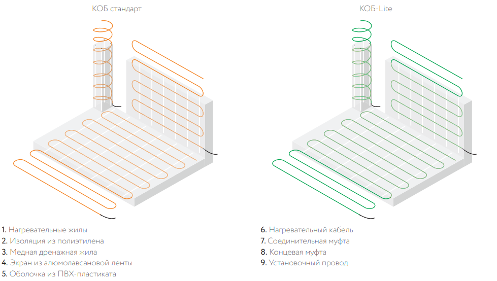 Кабель подогревает и сушит бетон необходимое время исходя из условий эксплуатации и размеров бетонной конструкции. После застывания бетона кабель отключают от сети питания, обрезают концы и оставляют внутри бетонной конструкции. Кабель поставляется в секциях. Широкий ассортимент производимых нагревательных секции КОБ позволяет подобрать необходимую мощность для обогрева конструкции любых типов (от малых габаритов колонн до больших площадей стен и перекрытий).