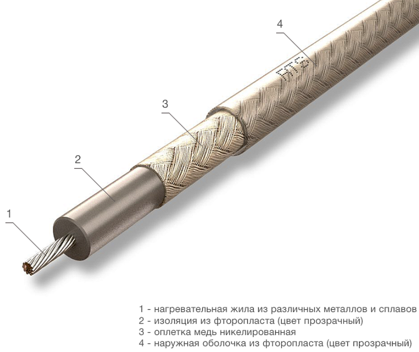 Кабель постоянной мощности RTS 5900 - одножильный резистивный нагревательный кабель с изоляцией из фторполимера и экраном из медных никелированных проволок в оболочке из фторполимера.
