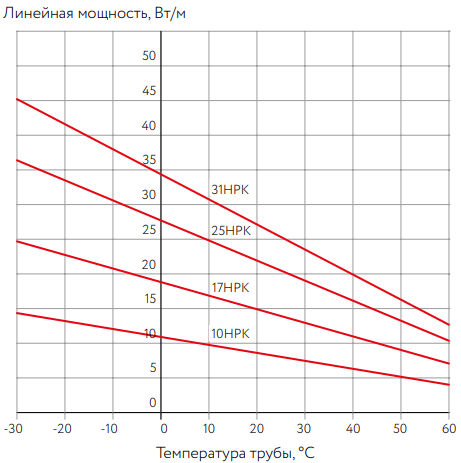 Номинальное тепловыделение для саморегулирующихся нагревательных кабелей при рабочем напряжении 230 В: