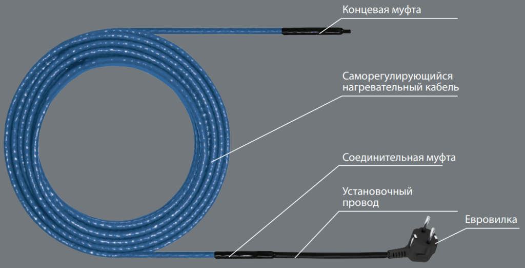 Нагревательная секция состоит из саморегулирующегося нагревательного кабеля, оснащенного установочным проводом с евровилкой на конце с одной стороны и концевой муфтой с другой. Нагревательный кабель состоит из двух проводников из луженой меди, промежуток между которыми заполнен специальным полупроводящим составом (полупроводящая матрица), изменяющим свое сопротивление в зависимости от температуры обогреваемого объекта. В целях электробезопасности и защиты полупроводящая матрица имеет изоляцию из термопластичного эластомера (ТПЭ), поверх которого наложена оплетка из луженой меди и оболочка из фторполимера. Соединительная и концевая муфты изготовлены в заводских условиях, надежны и герметичны.