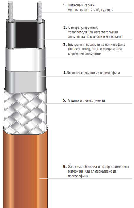 Элемент сопротивления с температурной зависимостью, находящийся между параллельно проложенными медными проводами PSB 07-5801-2155, регулирует и ограничивает теплоотдачу греющего кабеля в зависимости от температуры окружающей среды. Если повышается температура окружающей среды, снижается греющая мощность кабеля. Этот саморегулируемый температурный режим позволяет предотвратить перегрев кабеля даже при его пересечении. Термоограничитель не требуется (в том числе и во взрывоопасных условиях).