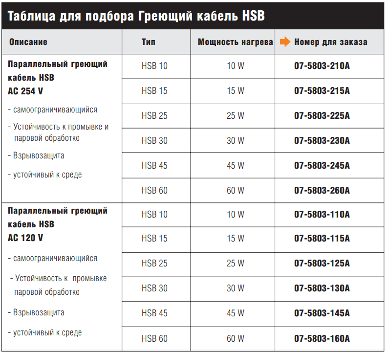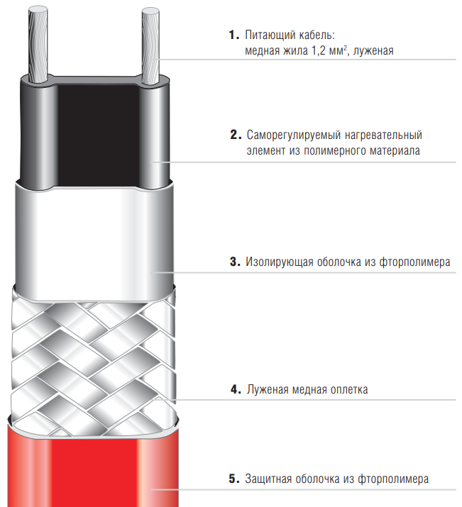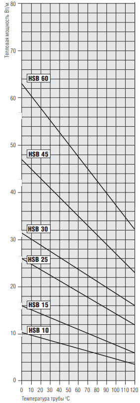 Элемент сопротивления с температурной зависимостью, находящийся между параллельно проложенными медными проводами HSB 07-5803-125A, регулирует и ограничивает теплоотдачу греющего кабеля. Эта регулировка мощности осуществляется автоматически в каждой точке греющего кабеля в зависимости от температуры окружающей среды. При повышении температуры окружающей среды снижается тепловая мощность кабеля. Благодаря этому саморегулированию предотвращается перегрев кабеля даже при его пересечении. Термоограничитель не требуется (в том числе и во взрывоопасных условиях).