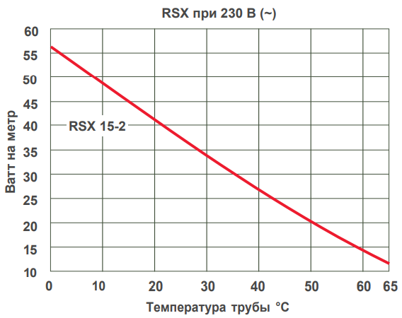 Выходная тепловая мощность кабеля зависит от температуры окружающей среды. При увеличении теплопотерь изолированной трубы, резервуара или оборудования (при уменьшении температуры окружающей среды), выходная тепловая мощность кабеля так же увеличивается. И наоборот, при уменьшении теплопотерь (при повышении температуры окружающей среды), выходная тепловая мощность кабеля снижается. Возможность саморегулировки кабеля RSX позволяет избежать температурного повреждения кабеля в местах нахлеста.
