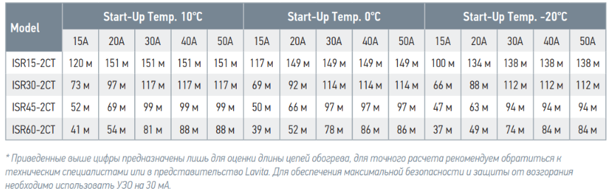 Максимальная длина нагревательной секции нагревательного кабеля LAVITA ISR рассчитывается, исходя из температуры включения и типа автоматического выключателя питания.