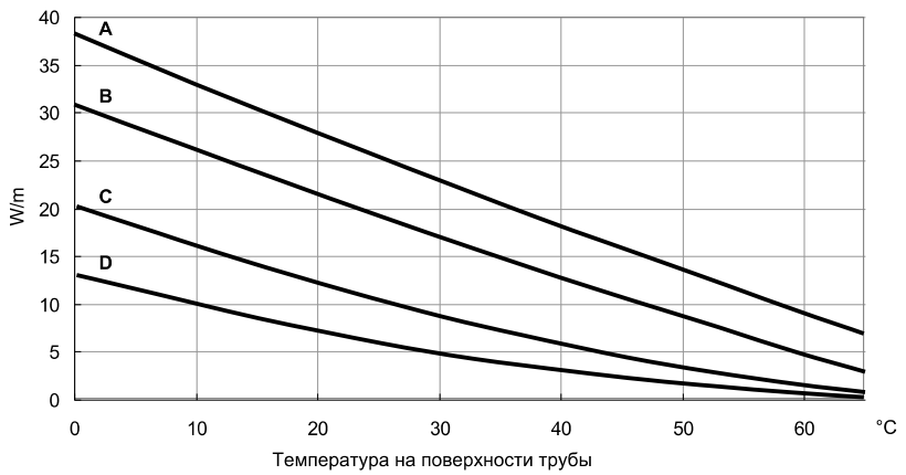 Зависимость мощности кабеля от температуры на поверхности металлической трубы Fujikura PGL-8-2SJ