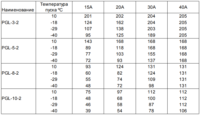 Таблица подбора кабеля Fujikura PGL-8-2SJ