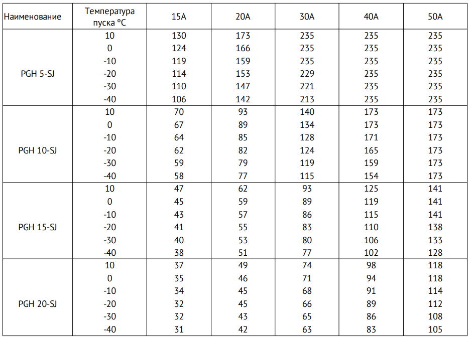 Таблица подбора кабеля на контуры Fujikura PGH-10-2SJ