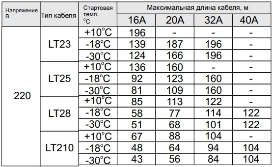 Максимальная длина нагревательной секции нагревательного кабеля LT рассчитывается, исходя из температуры включения и типа автоматического выключателя питания: