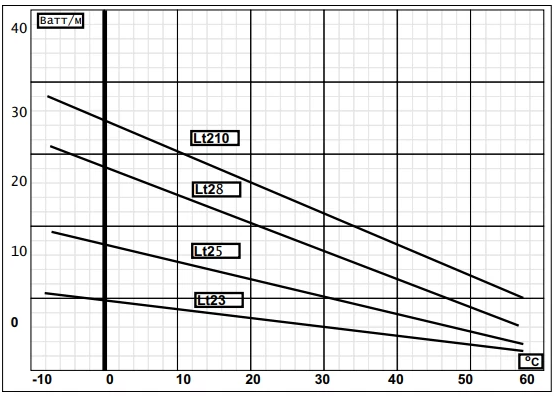 Номинальное тепловыделение в нормированных условиях для саморегулирующихся нагревательных кабелей LT с рабочим напряжением 220В: