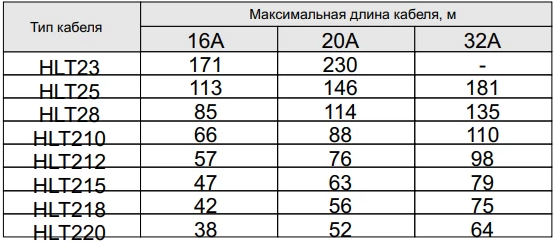 Максимальная длина нагревательной секции нагревательного кабеля HLT рассчитывается, исходя из температуры включения и типа автоматического выключателя питания: