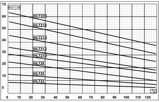 Номинальное тепловыделение в нормированных условиях для саморегулирующихся нагревательных кабелей HLT с рабочим напряжением 220В: