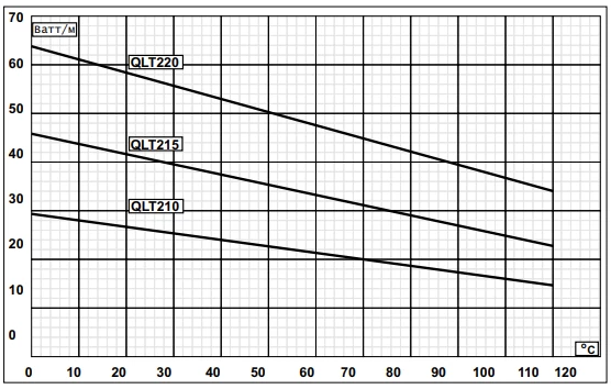 Номинальное тепловыделение в нормированных условиях для саморегулирующихся нагревательных кабелей QLT с рабочим напряжением 220В: