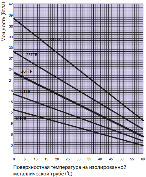 График зависимости удельной мощности кабеля от температуры 33TTR-2-BOТ