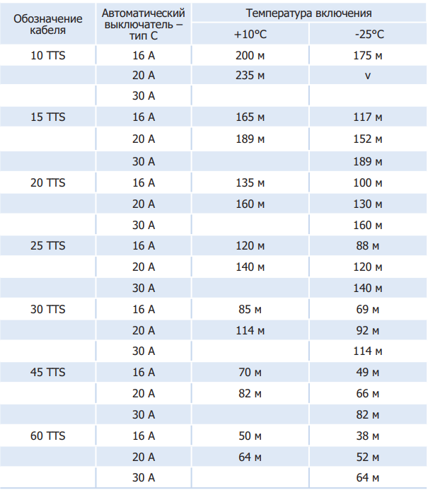 Максимальная рекомендуемая длина нагревательного кабеля при напряжении сети 230 В 45TTS-2-BОТ