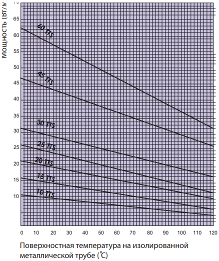 График зависимости удельной мощности кабеля от температуры 45TTS-2-BОТ