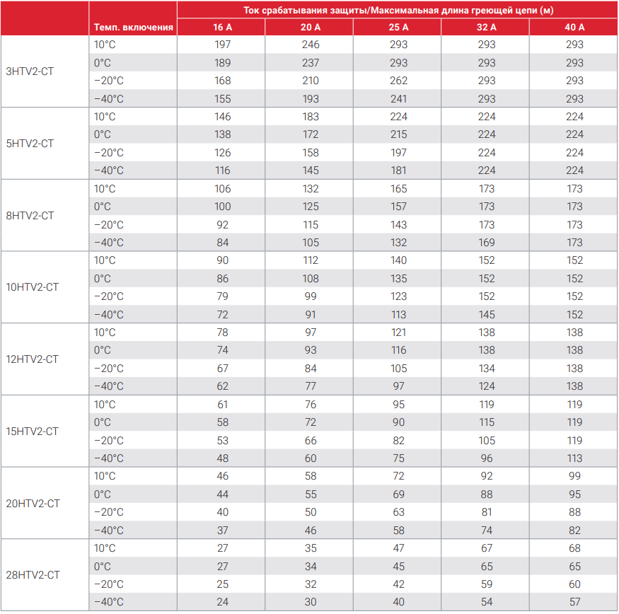 Макс. длина цепи обогрева при использовании автоматического выключателя типа "C" согласно EN 60898 Raychem 15HTV2-CT-T3