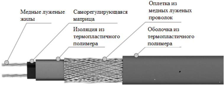 В основе саморегулирующегося нагревательного кабеля КНС 2ЛТГ-ЭЛ-Ex лежит полупроводниковая матрица с двумя медными жилами, идущими параллельно. Нагрев кабеля происходит за счет матрицы, изменяющей свое сопротивление в зависимости от температуры среды. Это обеспечивает эффект саморегулирования: при повышении температуры сопротивление матрицы увеличивается, тепловыделение уменьшается и наоборот. Благодаря такому принципу работы, греющий кабель КНС не перегревается и не выходит из строя, даже если отдельные его участки накладываются друг на друга.