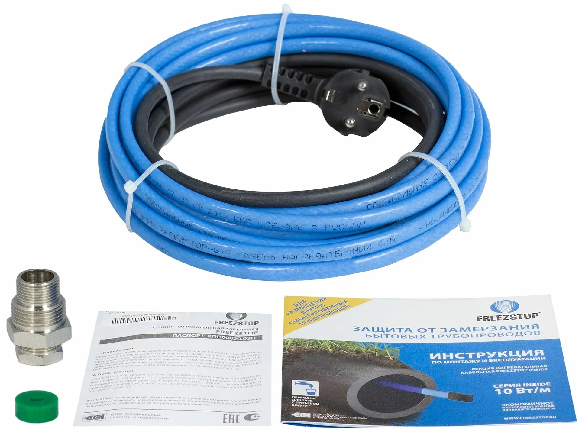 Freezstop Inside-10-7 комплект саморегулирующегося греющего кабеля соответствует всем заявленным характеристикам и поставляется с официальной гарантией.