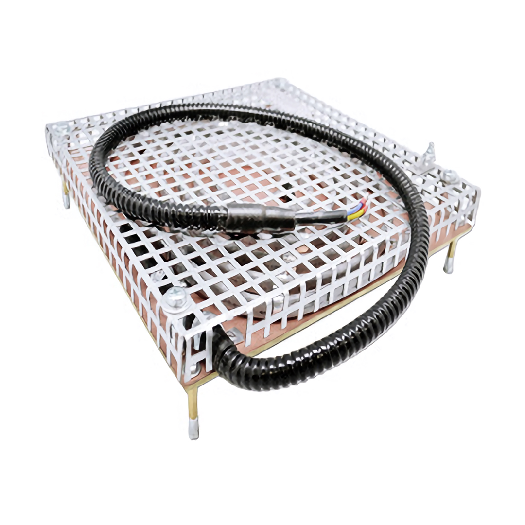 На монтажную панель фиксируется саморегулирующийся греющий кабель змеевидной или спиралевидной формы. Сверху монтажной панели фиксируется крышка, изолирующая греющий кабель и выполняющая теплообменную функцию. По периметру монтажная панель и крышка фиксируются между собой заклепками. По бокам панели устанавливаются монтажные кронштейны. На днище греющей пластины установлен взрывозащищенный переходник для соединения греющего кабеля с питающим кабелем. На корпусе пластины имеется элемент заземления. Размер пластины обусловлен мощностью и количеством греющего кабеля. Мощность и количество греющего кабеля подбирается на основании тепловых расчетов.