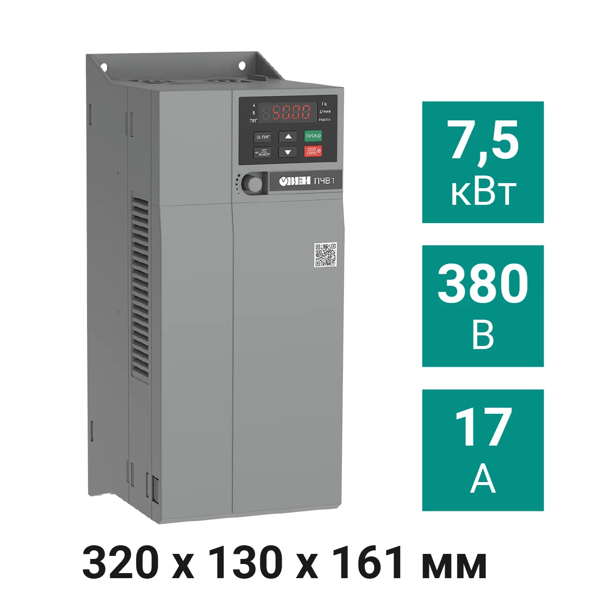 Преобразователь частоты ПЧВ1-7К5-В [М01] предназначен для управления электродвигателями мощностью 7,5 кВт. Номинальный выходной ток – 17,0 А, использует трехфазный источник питания переменного напряжения 380 В.