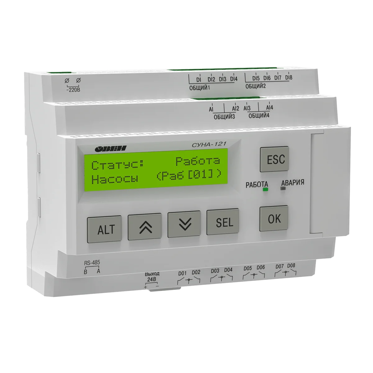 СУНА-121 - контроллер с готовыми алгоритмами для управления насосными группами. Предназначен для применения в системах водоснабжения, водозабора, повышения давления, канализационных сооружений и прочих объектов, на которых требуется управление насосами.