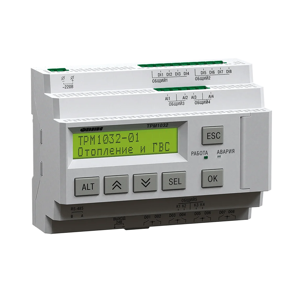 ТРМ1032 - контроллер с готовым алгоритмом регулирования температуры в системах отопления и ГВС. Предназначен для применения в индивидуальных и центральных тепловых пунктах (ИТП и ЦТП) и котельных. Регулятор отопления и ГВС поддерживает температуру по заданной уставке или отопительному графику, управляет запорно-регулирующим клапаном (КЗР), циркуляционными насосами, поддерживает давление системы, управляя контуром подпитки.