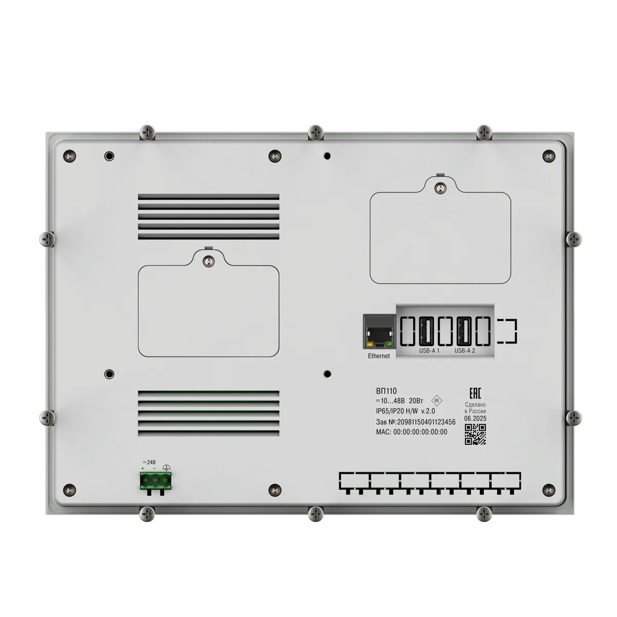 Корпус web-панели ВП110 с лицевой стороны защищен от пыли и влаги, степень защиты – IP65. Глянцевая поверхность лицевой стороны легко очищается. ВП110 имеет щитовое крепление и возможность крепежа по стандарту VESA100.