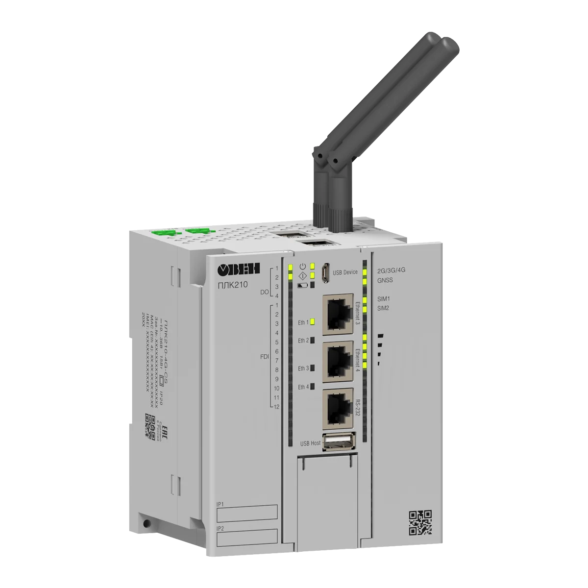 ОВЕН ПЛК210-4G – высокопроизводительный моноблочный контроллер со встроенным LTE-модемом, модулем GNSS (GPS/ГЛОНАСС) и тремя RS-485. Подходит для автоматизации территориально распределенных объектов, где необходимо использовать мобильную сеть, и выполняет роль коммуникационного контроллера для диспетчеризации.