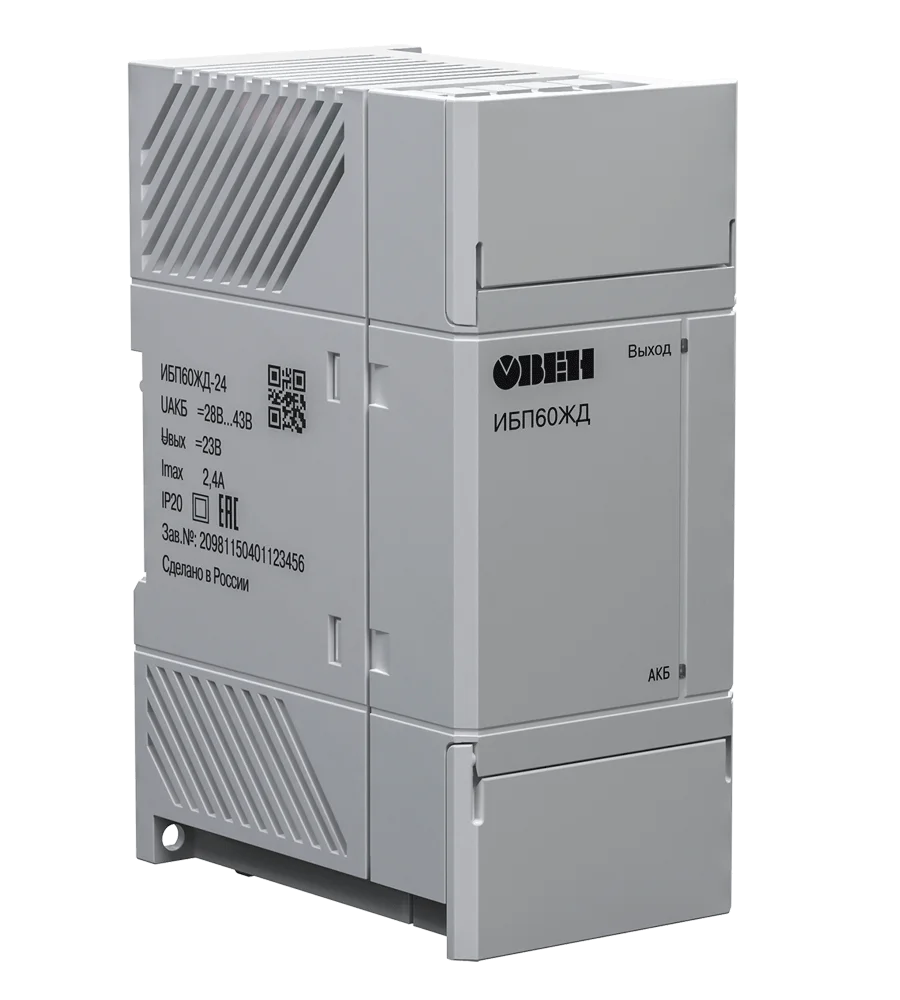 ОВЕН ИБП60ЖД-24 предназначен для использования в качестве резервированного источника вторичного питания при работе от источника постоянного тока ОВЕН БП60К 24 В или от резервной сети питания постоянного тока ЖД станций (28...43 В).