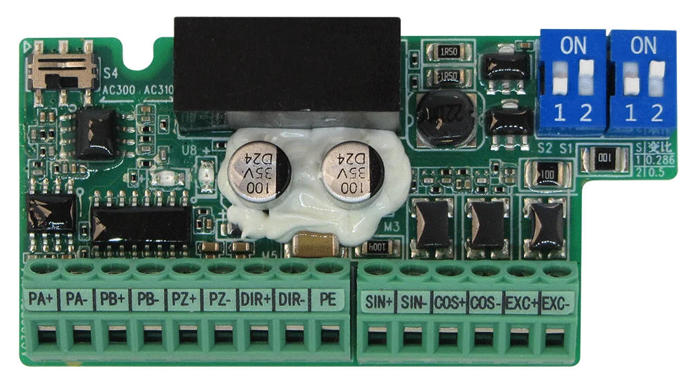 Плата ПРЕ1 предназначена для подключения резольверов в качестве обратной связи по скорости. Дополнительно плата оснащена эмулятором выходного сигнала квадратурного энкодера с дифференциальным выходом. Плата предназначена для работы с ПЧВ3 [M01].