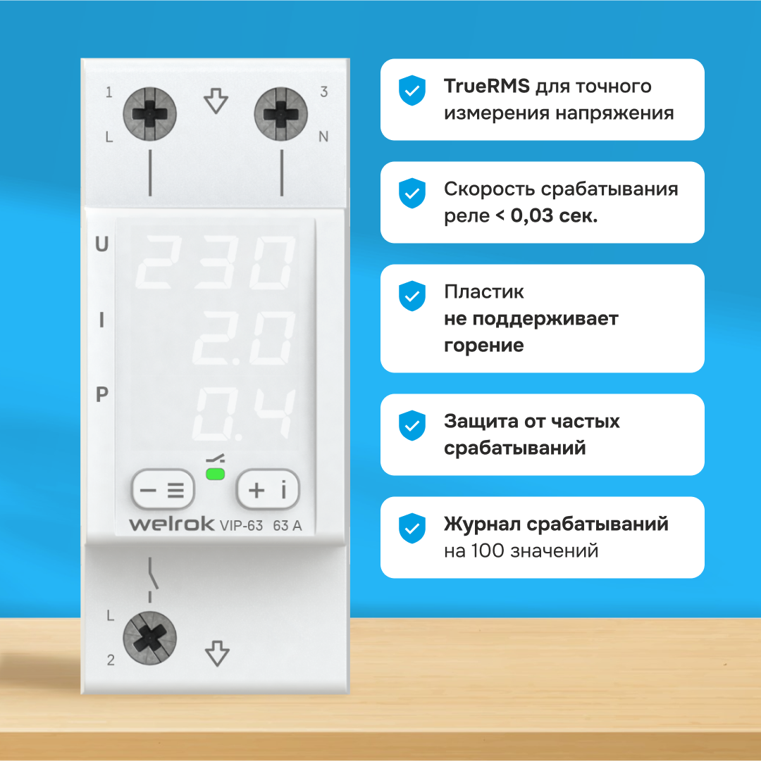 Welrok VIP-63 реле напряжения с контролем тока и мощности соответствует всем заявленным характеристикам и поставляется с официальной гарантией.