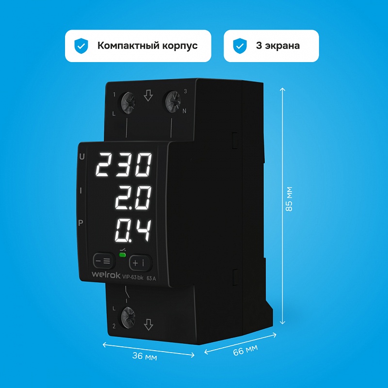 Welrok VIP-63 bk реле напряжения с контролем тока и мощности соответствует всем заявленным характеристикам и поставляется с официальной гарантией.