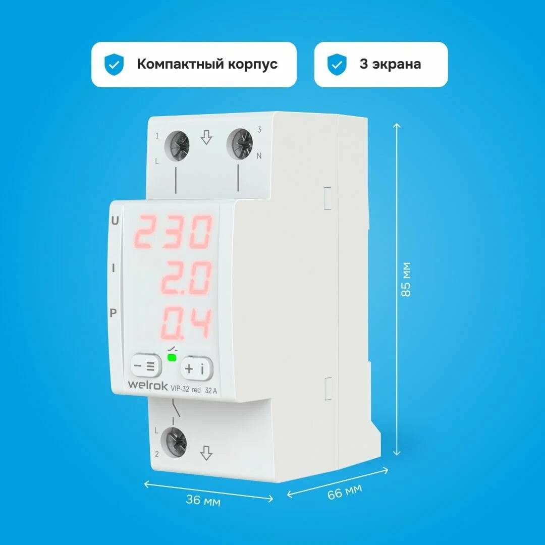 Welrok VIP-32 red реле напряжения с контролем тока и мощности соответствует всем заявленным характеристикам и поставляется с официальной гарантией.
